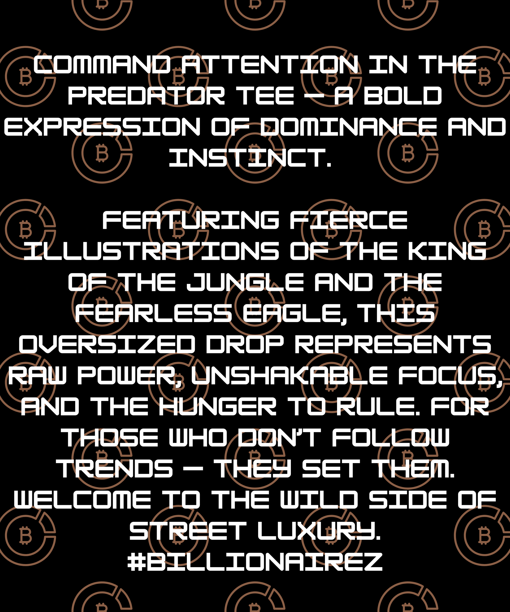 Command attention in the Predator Tee — a bold expression of dominance and instinct. Featuring fierce illustrations of the king of the jungle and the fearless eagle, this oversized drop represents raw power, unshakable focus, and the hunger to rule. For those who don’t follow trends — they set them. Welcome to the wild side of street luxury. #BillionaireZ