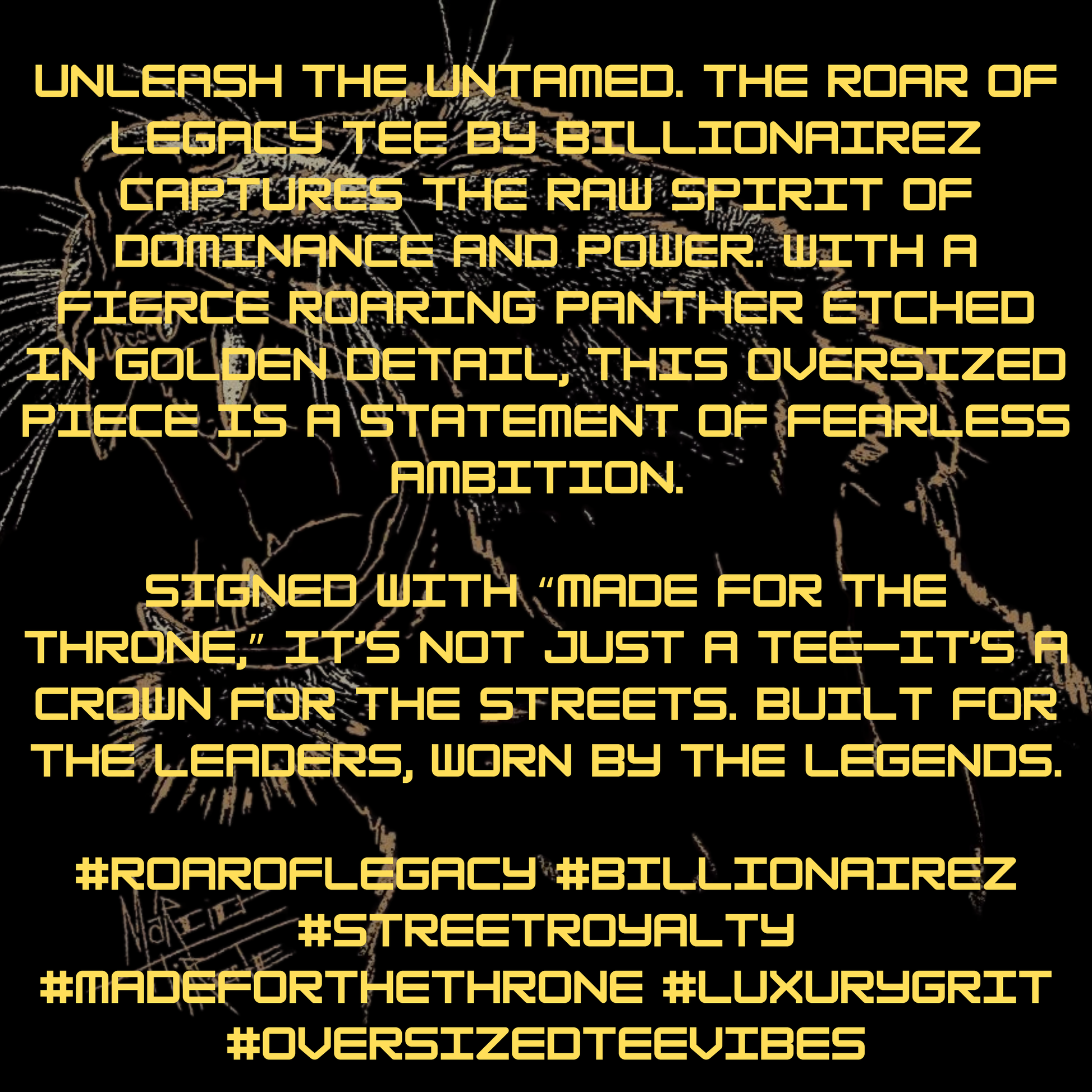 #RoarOfLegacy #BillionaireZ #StreetRoyalty #MadeForTheThrone #LuxuryGrit #OversizedTeeVibes