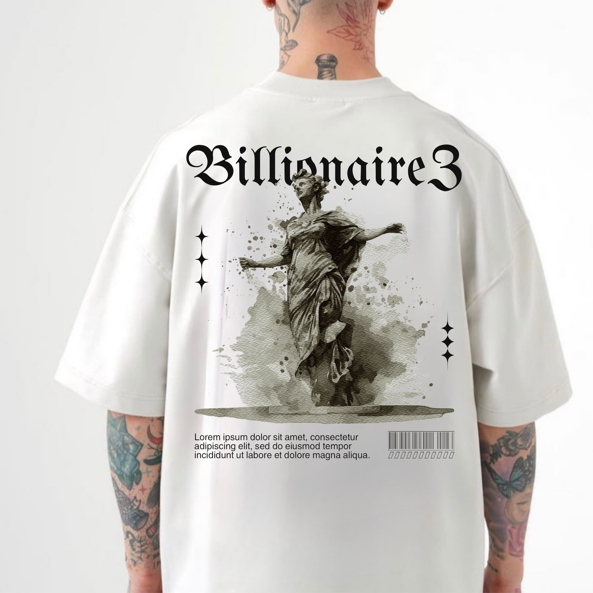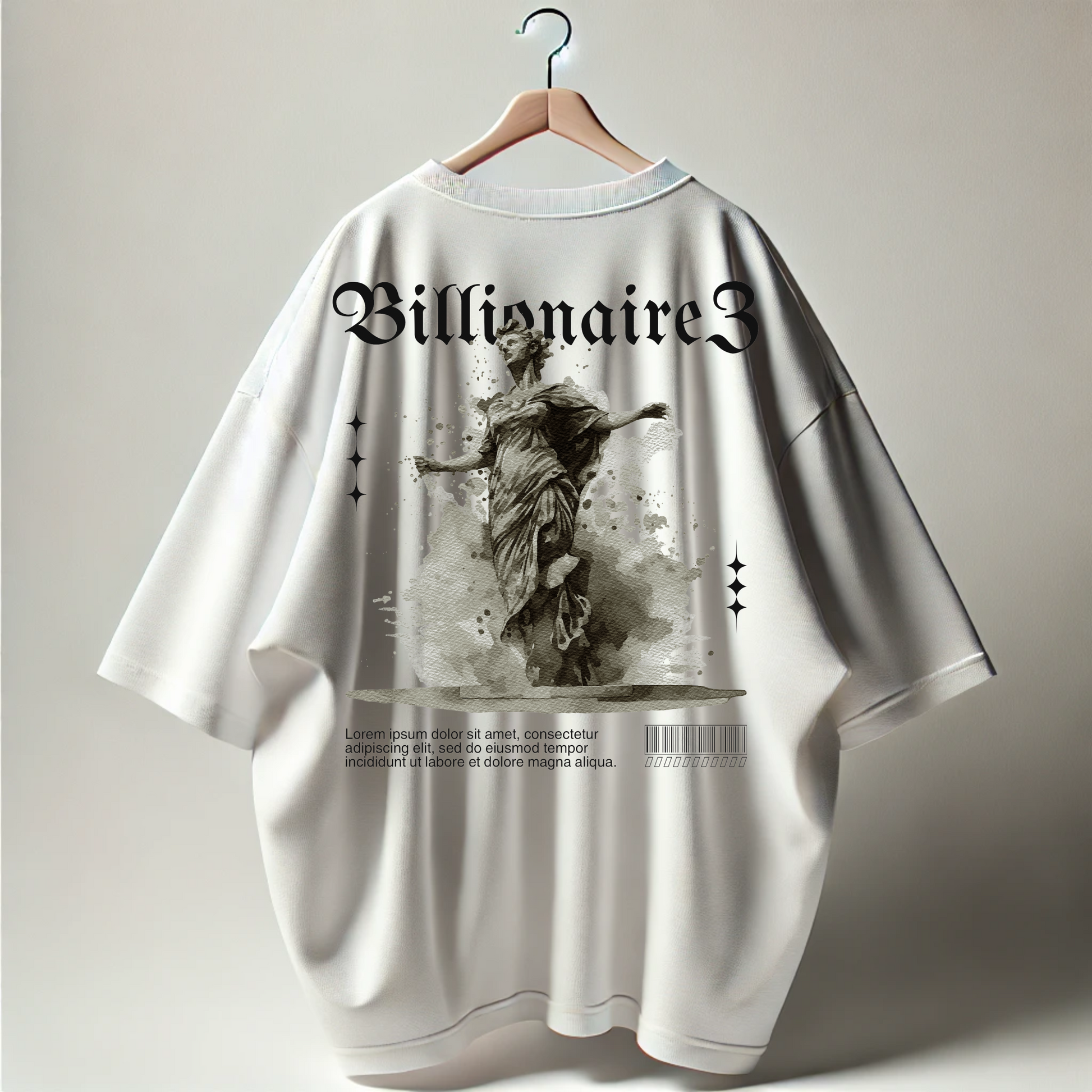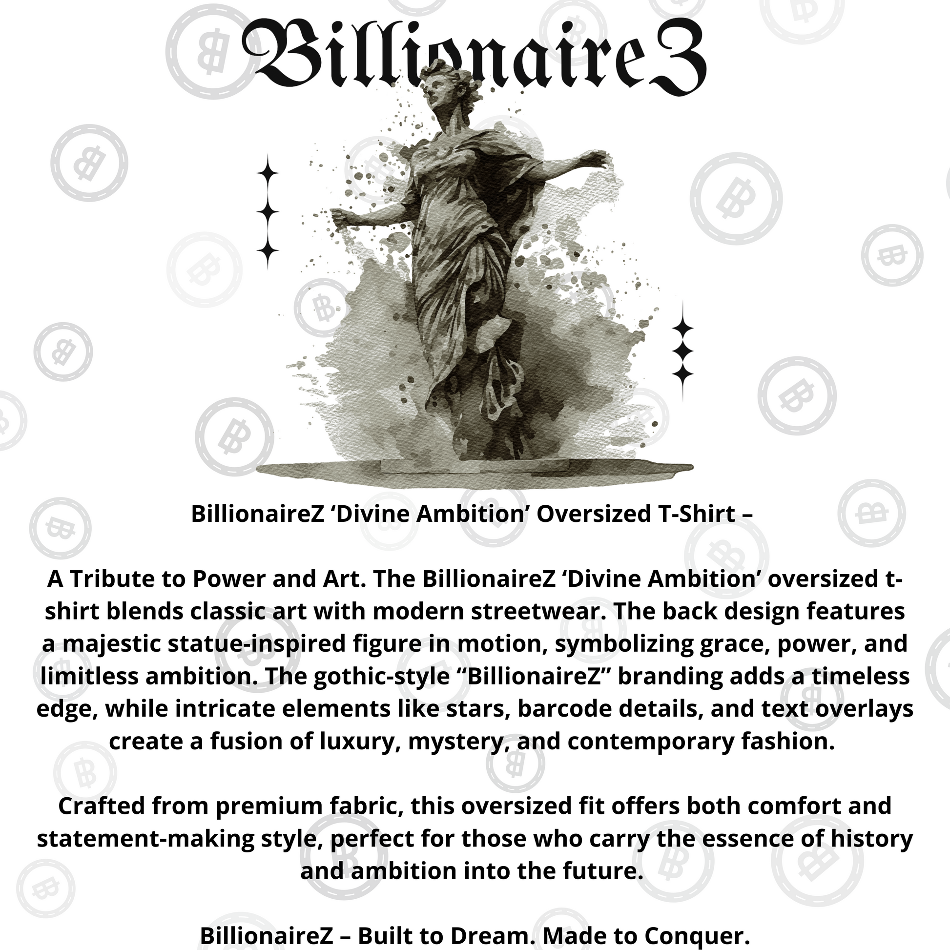 BillionaireZ ‘Divine Ambition’ Oversized T-Shirt – A Tribute to Power and Art. The BillionaireZ ‘Divine Ambition’ oversized t-shirt blends classic art with modern streetwear. The back design features a majestic statue-inspired figure in motion, symbolizing grace, power, and limitless ambition. The gothic-style “BillionaireZ” branding adds a timeless edge, while intricate elements like stars, barcode details, and text overlays create a fusion of luxury, mystery, and contemporary fashion. Crafted from premium fabric, this oversized fit offers both comfort and statement-making style, perfect for those who carry the essence of history and ambition into the future. BillionaireZ – Built to Dream. Made to Conquer.
