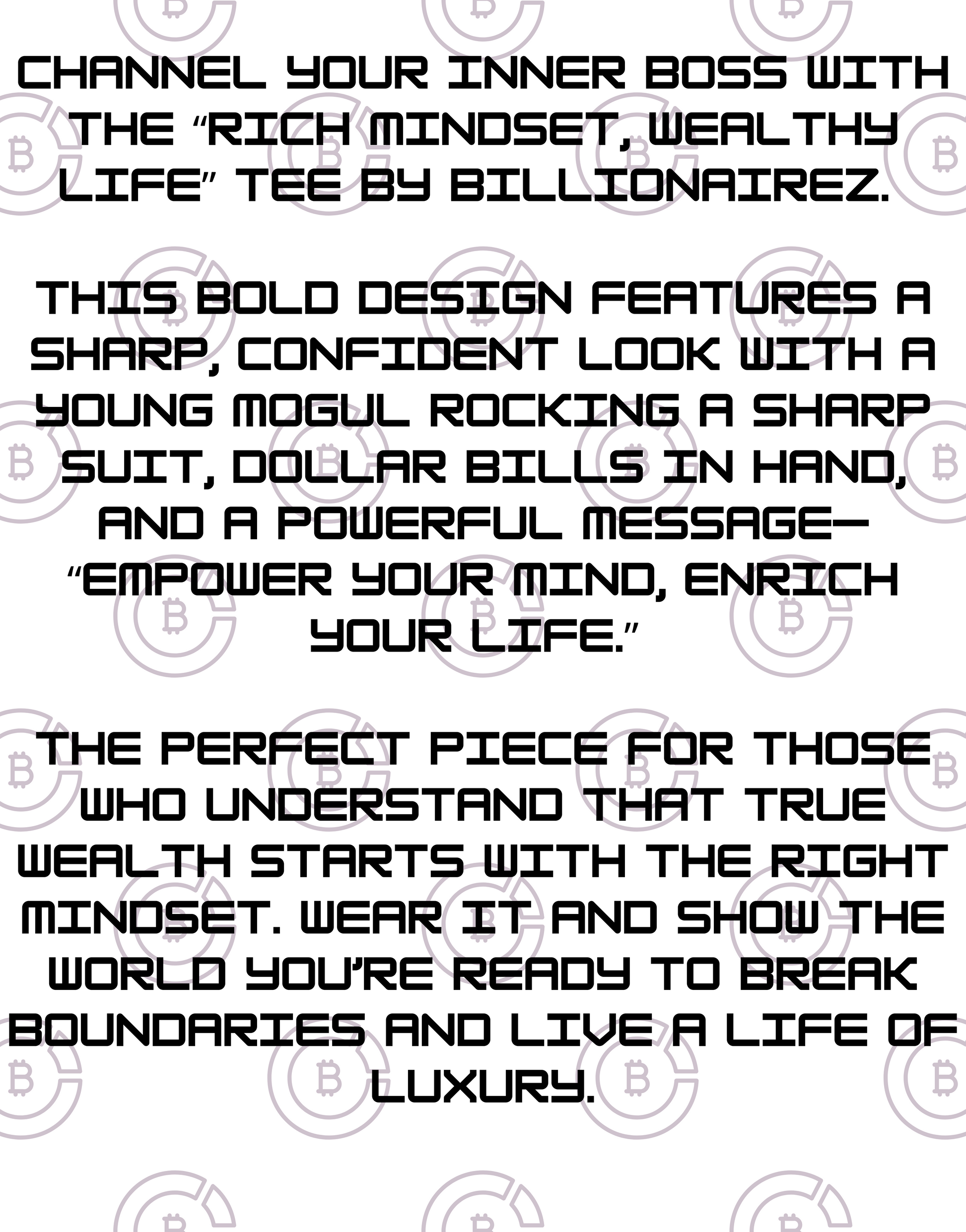 Channel your inner boss with the “Rich Mindset, Wealthy Life” tee by BillionaireZ. This bold design features a sharp, confident look with a young mogul rocking a sharp suit, dollar bills in hand, and a powerful message—“Empower Your Mind, Enrich Your Life.”