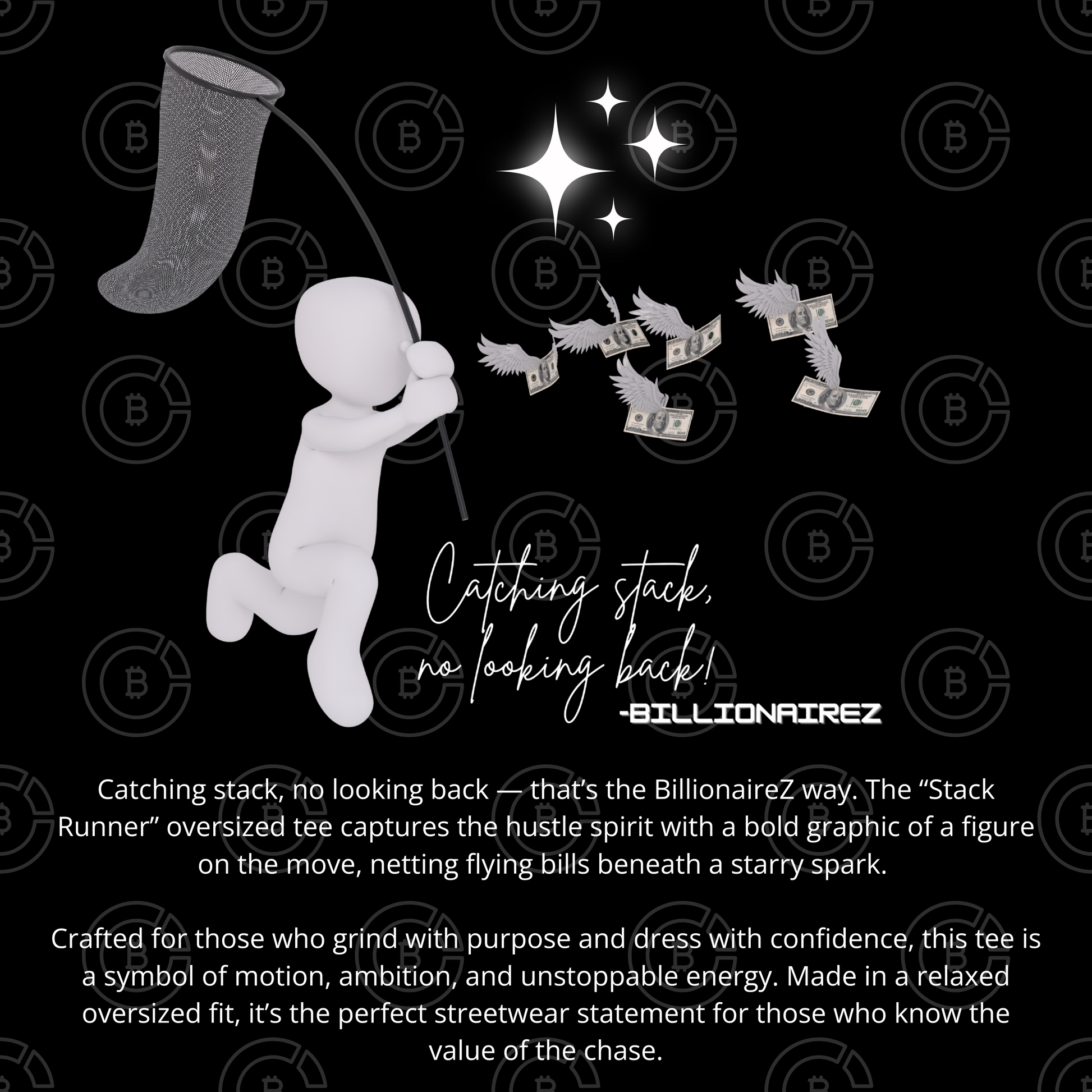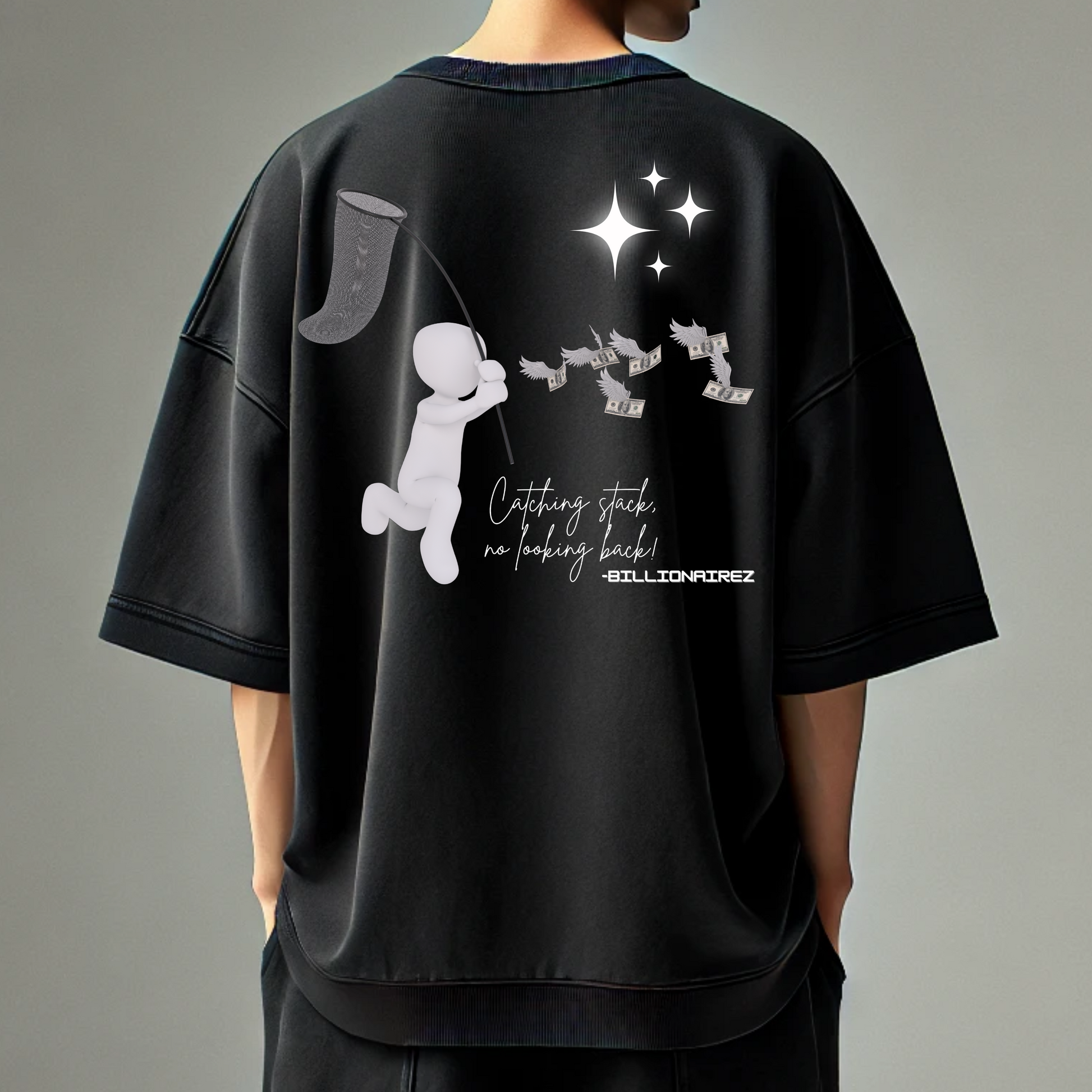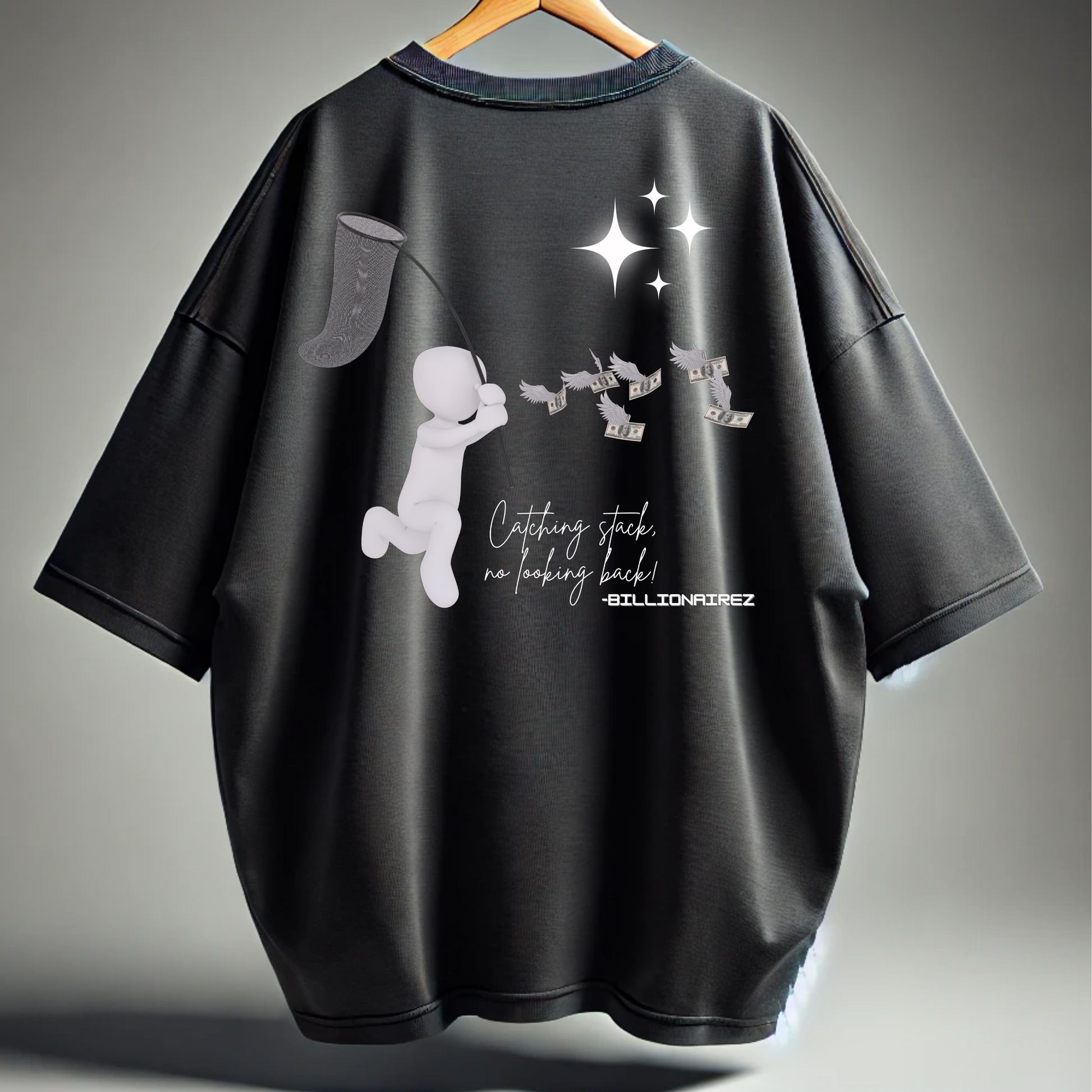 Catching stack, no looking back — that’s the BillionaireZ way. The “Stack Runner” oversized tee captures the hustle spirit with a bold graphic of a figure on the move, netting flying bills beneath a starry spark. Crafted for those who grind with purpose and dress with confidence, this tee is a symbol of motion, ambition, and unstoppable energy. Made in a relaxed oversized fit, it’s the perfect streetwear statement for those who know the value of the chase.