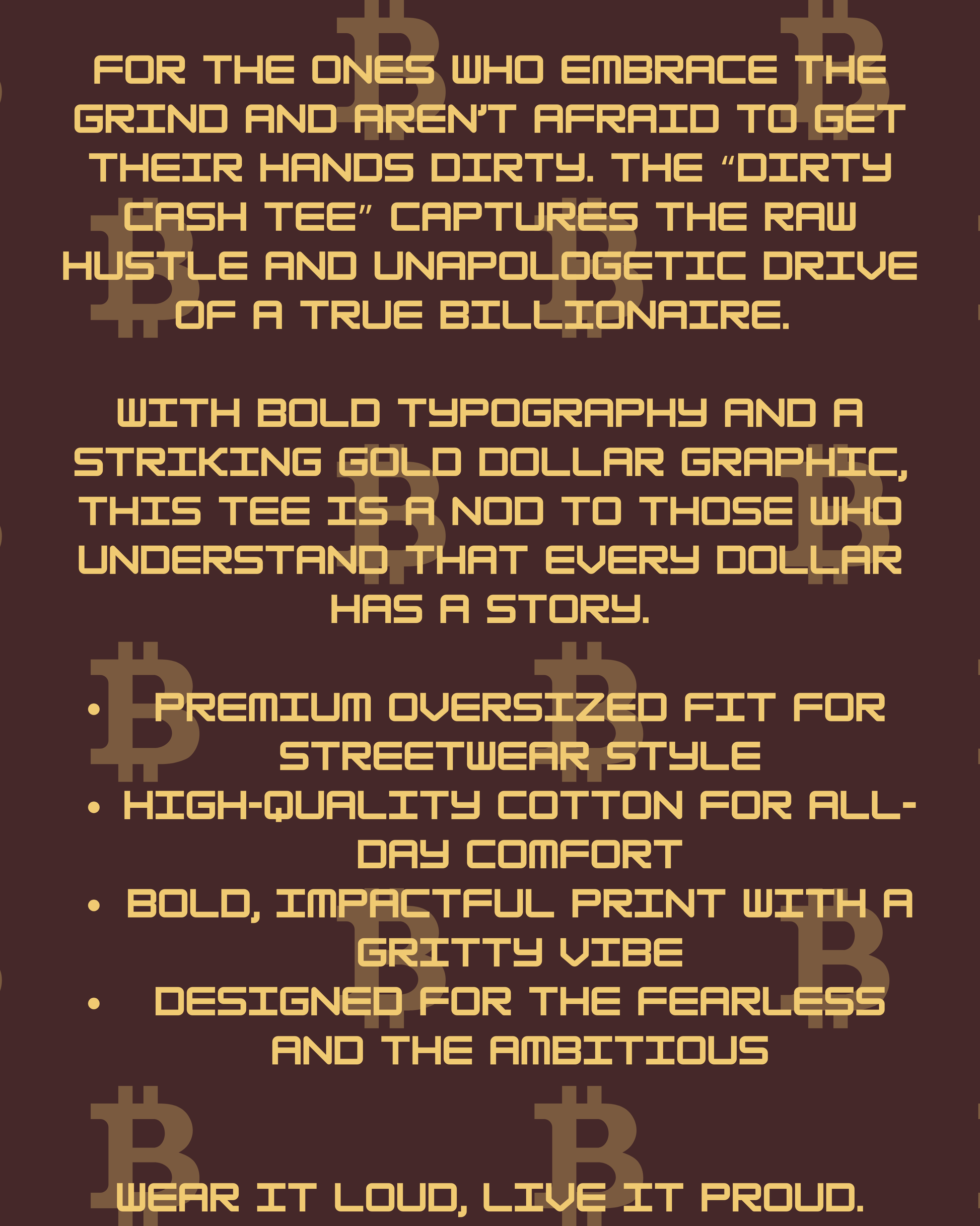 For the ones who embrace the grind and aren’t afraid to get their hands dirty. The “Dirty Cash Tee” captures the raw hustle and unapologetic drive of a true billionaire. With bold typography and a striking gold dollar graphic, this tee is a nod to those who understand that every dollar has a story.