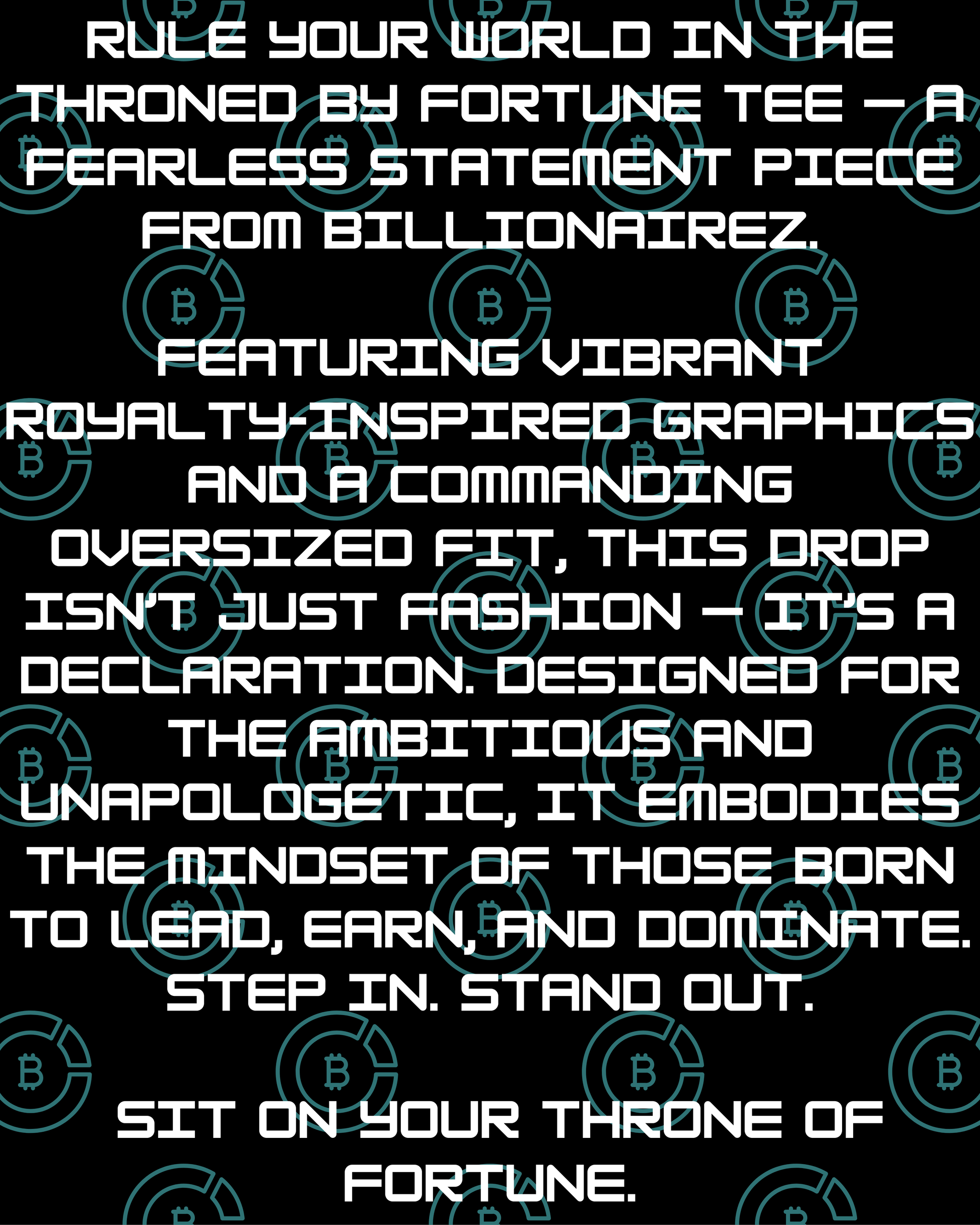 Rule your world in the Throned by Fortune tee — a fearless statement piece from BillionaireZ. Featuring vibrant royalty-inspired graphics and a commanding oversized fit, this drop isn’t just fashion — it’s a declaration. Designed for the ambitious and unapologetic, it embodies the mindset of those born to lead, earn, and dominate. Step in. Stand out. Sit on your throne of fortune.