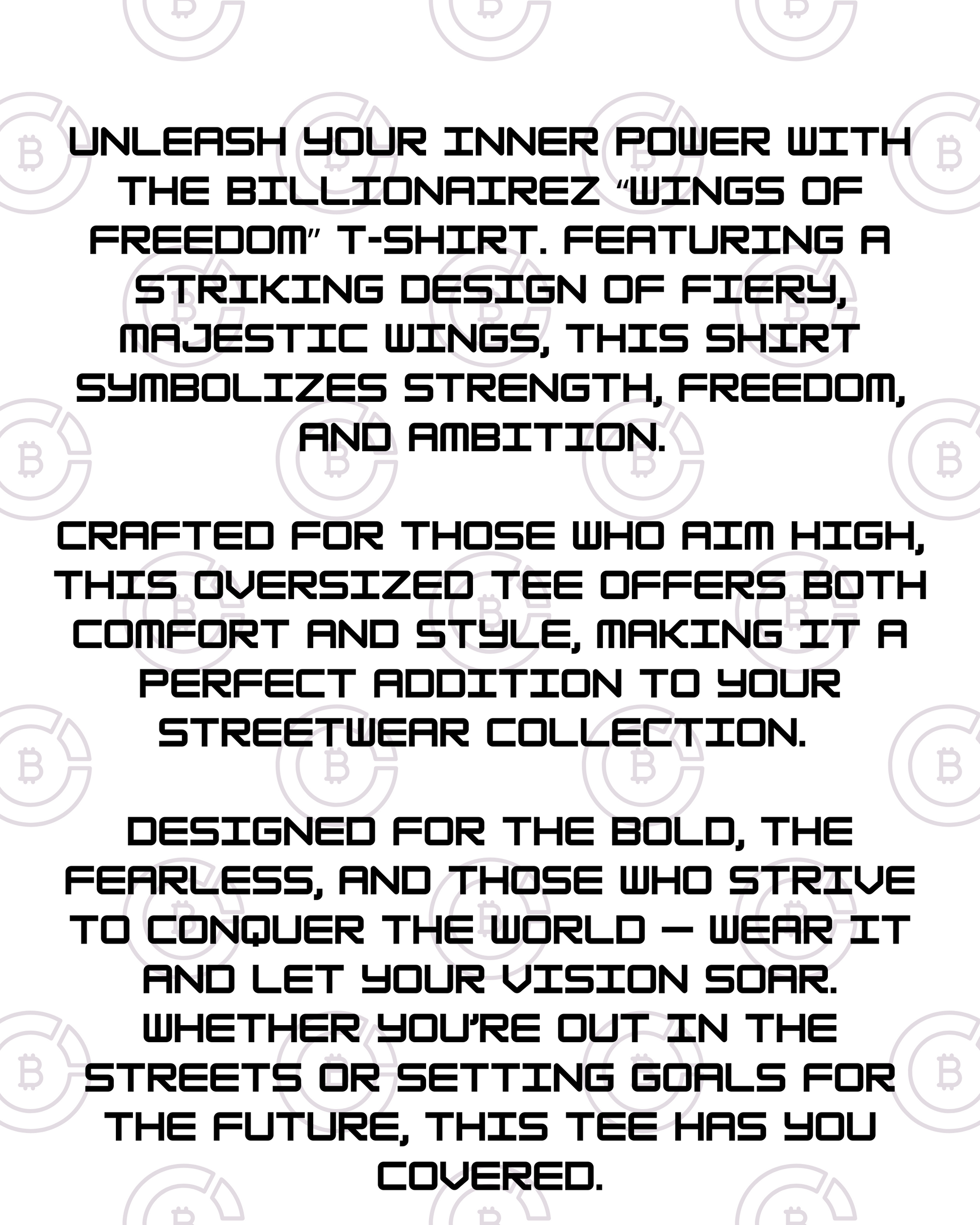 Unleash your inner power with the BillionaireZ “Wings of Freedom” T-shirt. Featuring a striking design of fiery, majestic wings, this shirt symbolizes strength, freedom, and ambition.