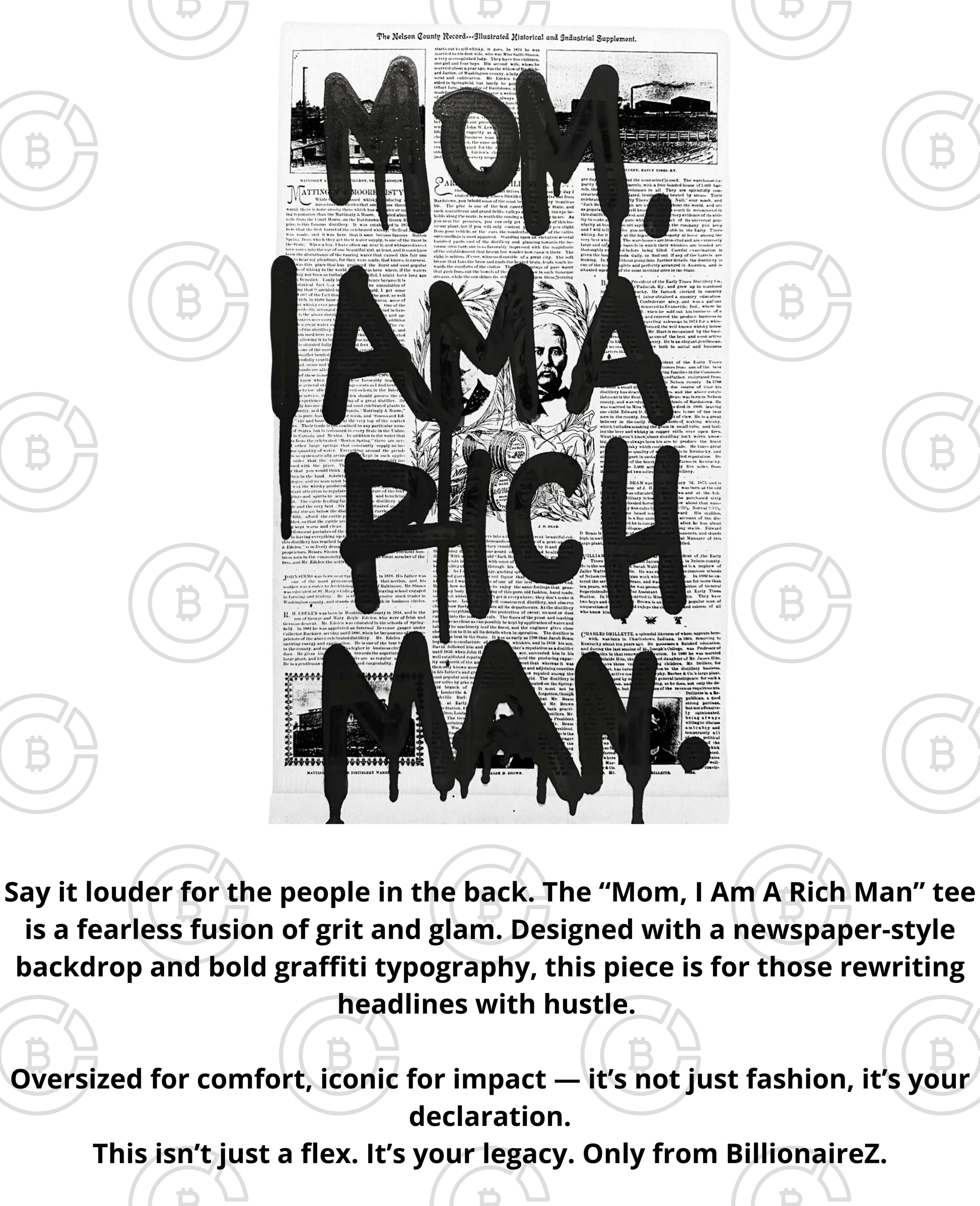 Say it louder for the people in the back. The “Mom, I Am A Rich Man” tee is a fearless fusion of grit and glam. Designed with a newspaper-style backdrop and bold graffiti typography, this piece is for those rewriting headlines with hustle.